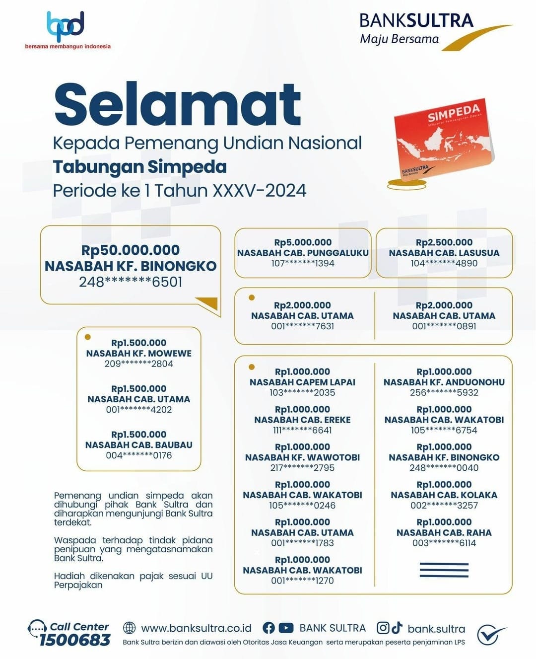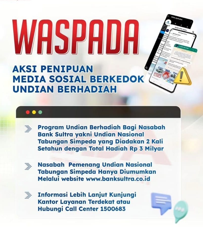 Dalam imbauannya dijelaskan program undian berhadiah bagi nasabah Bank Sultra yakni undian nasional tabungan Simpanan Pembangunan Daerah (Simpeda) yang diadakan dua kali setahun dengan total hadiah Rp3 Miliar.
