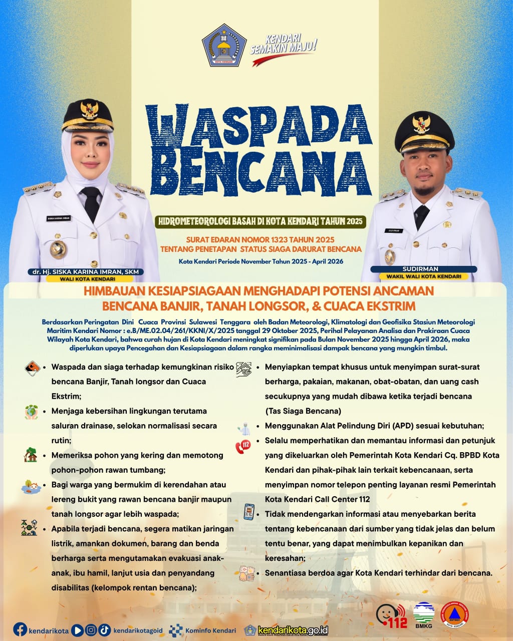Menindaklanjuti Surat Keputusan (SK) Siaga Darurat tersebut, Pemkot Kendari melakukan inovasi dalam pola komunikasi publik. Himbauan kesiapsiagaan yang tertuang dalam Surat Edaran Nomor 1323 Tahun 2025 kini tidak hanya disebarkan dalam bentuk surat konvensional, melainkan dikemas dalam bentuk flyer digital yang menarik.