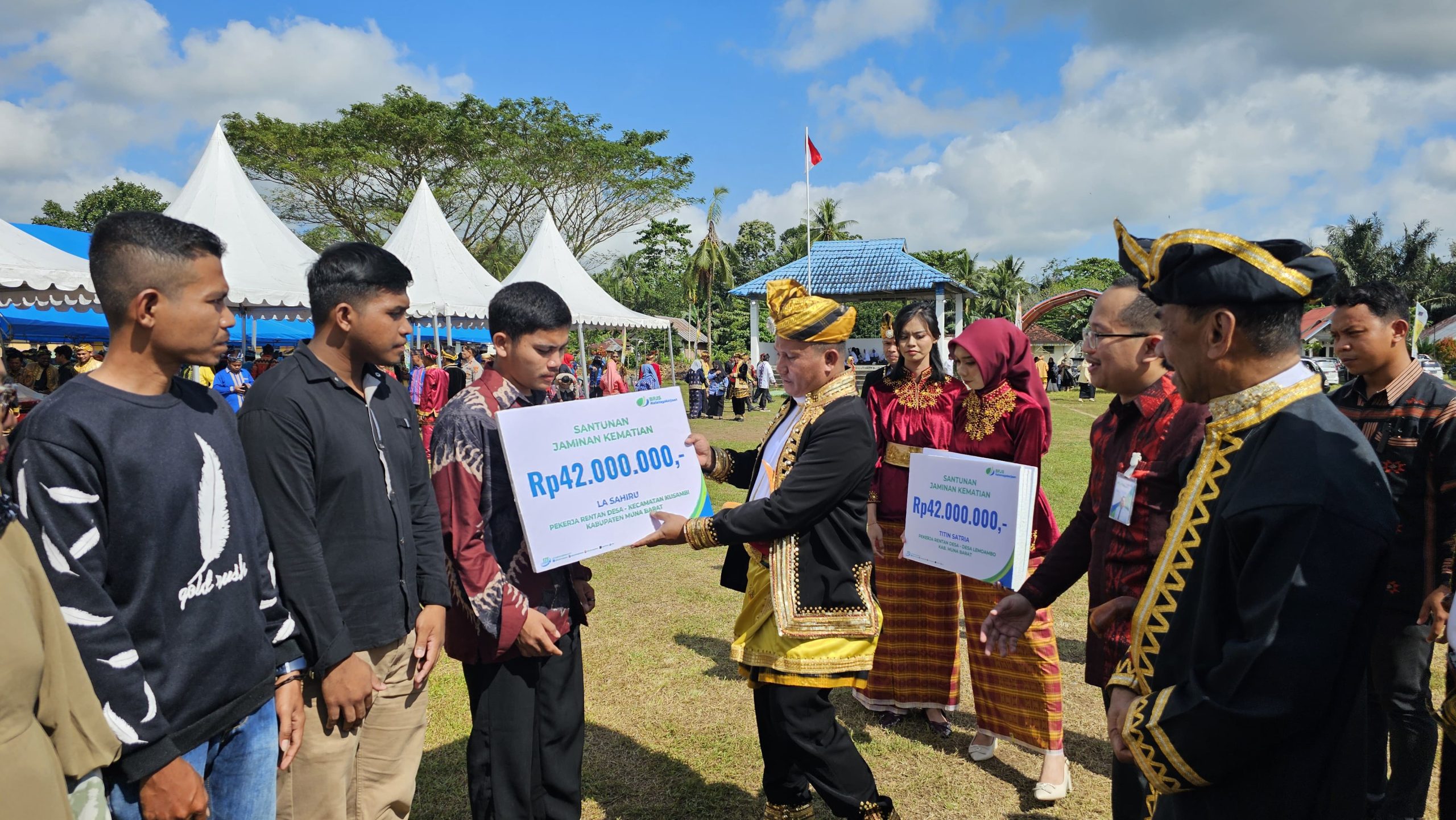 Usai upacara tersebut, sebanyak 10 orang ahli waris pekerja rentan yang telah didaftarkan oleh Pemkab Mubar menerima santunan dari Badan Penyelenggara Jaminan Sosial Ketenagakerjaan (BP Jamsostek). Ke 10 ahli waris ini menerima santunan jaminan kematian.