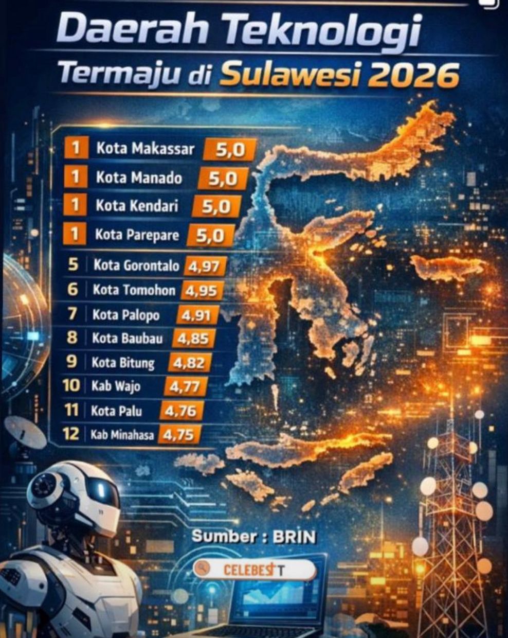 KORANHeadline.com, KENDARI – Badan Riset dan Inovasi Nasional (BRIN) merilis daftar Daerah Teknologi Termaju di Sulawesi Tahun 2026. Hasilnya, empat kota berhasil meraih skor tertinggi sempurna 5,0 dan menempati posisi pertama secara bersamaan.