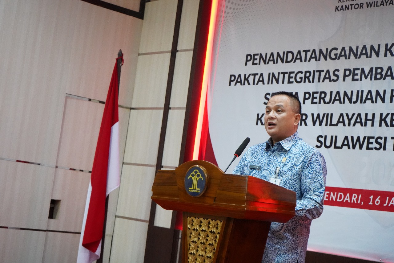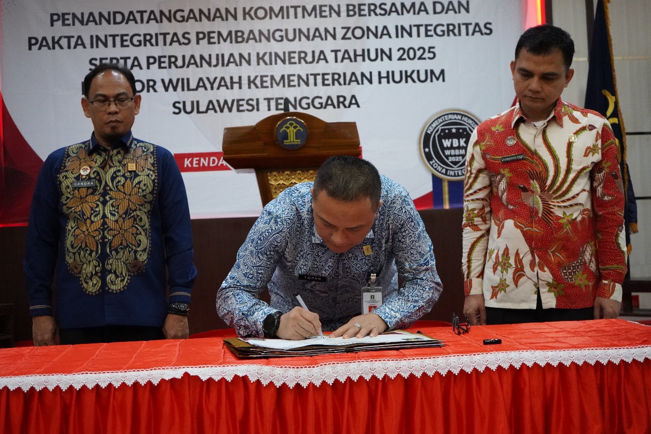 KORANHeadline.com, KENDARI – Kantor Wilayah Kementerian Hukum Sulawesi Tenggara menggelar Penandatanganan Komitmen Bersama Pembangunan Zona Integritas, Pakta Integritas dan Perjanjian Kinerja Tahun 2025 di Aula Kantor Wilayah, Kamis (16/1/2025).
