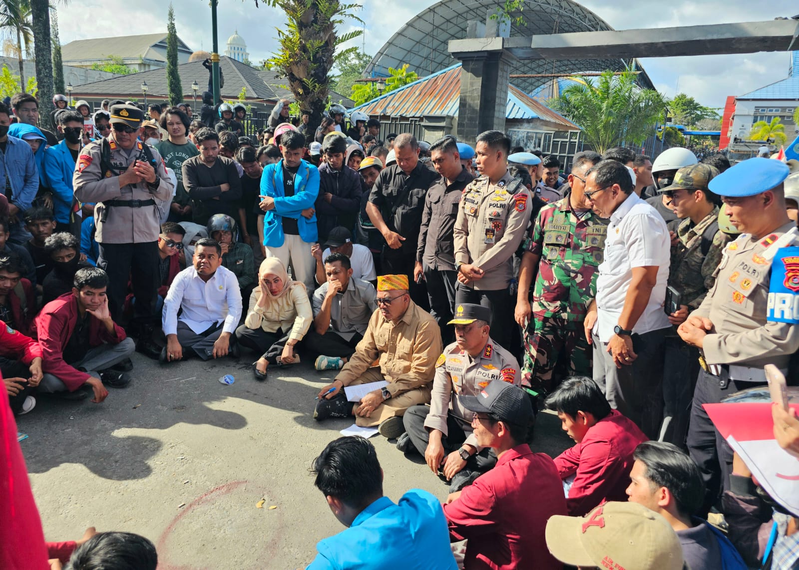 Meski panas terik matahari, Irjen Pol Didik Widjanarko mengajak seluruh personelnya duduk bersama mahasiswa untuk berdiskusi.
