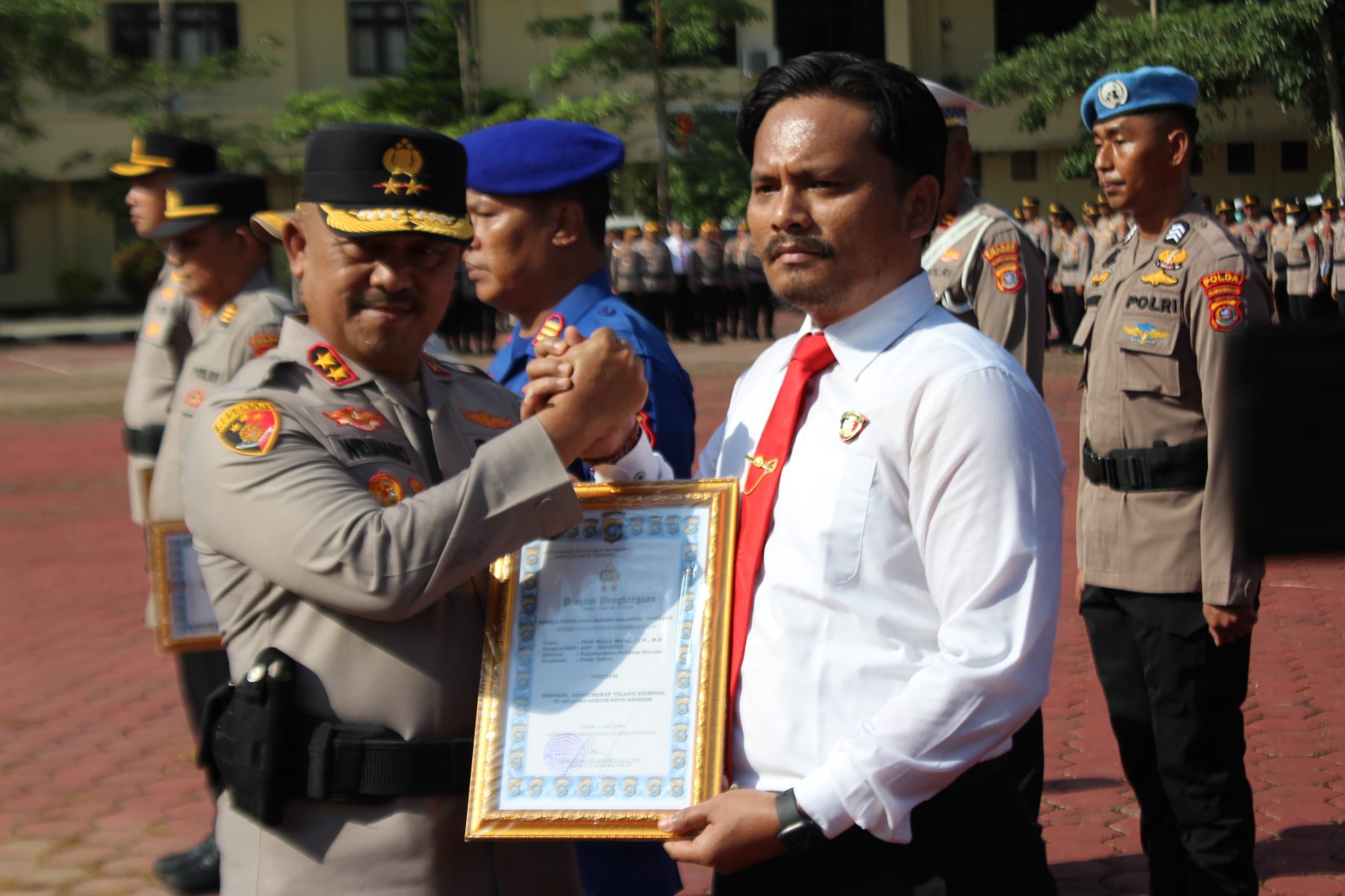 KORANHeadline.com, KENDARI – Kepala Kepolisian Daerah Sulawesi Tenggara (Kapolda Sultra), Irjen Pol Didik Agung Widjanarko, S.I.K., M.H., memberikan penghargaan (reward) kepada sejumlah personel yang menunjukkan dedikasi dan prestasi luar biasa. Penyerahan penghargaan ini dilakukan secara resmi dalam Upacara Kesadaran Nasional yang berlangsung di Lapangan Apel Presisi Mapolda Sultra, Jumat (17/4/2026).