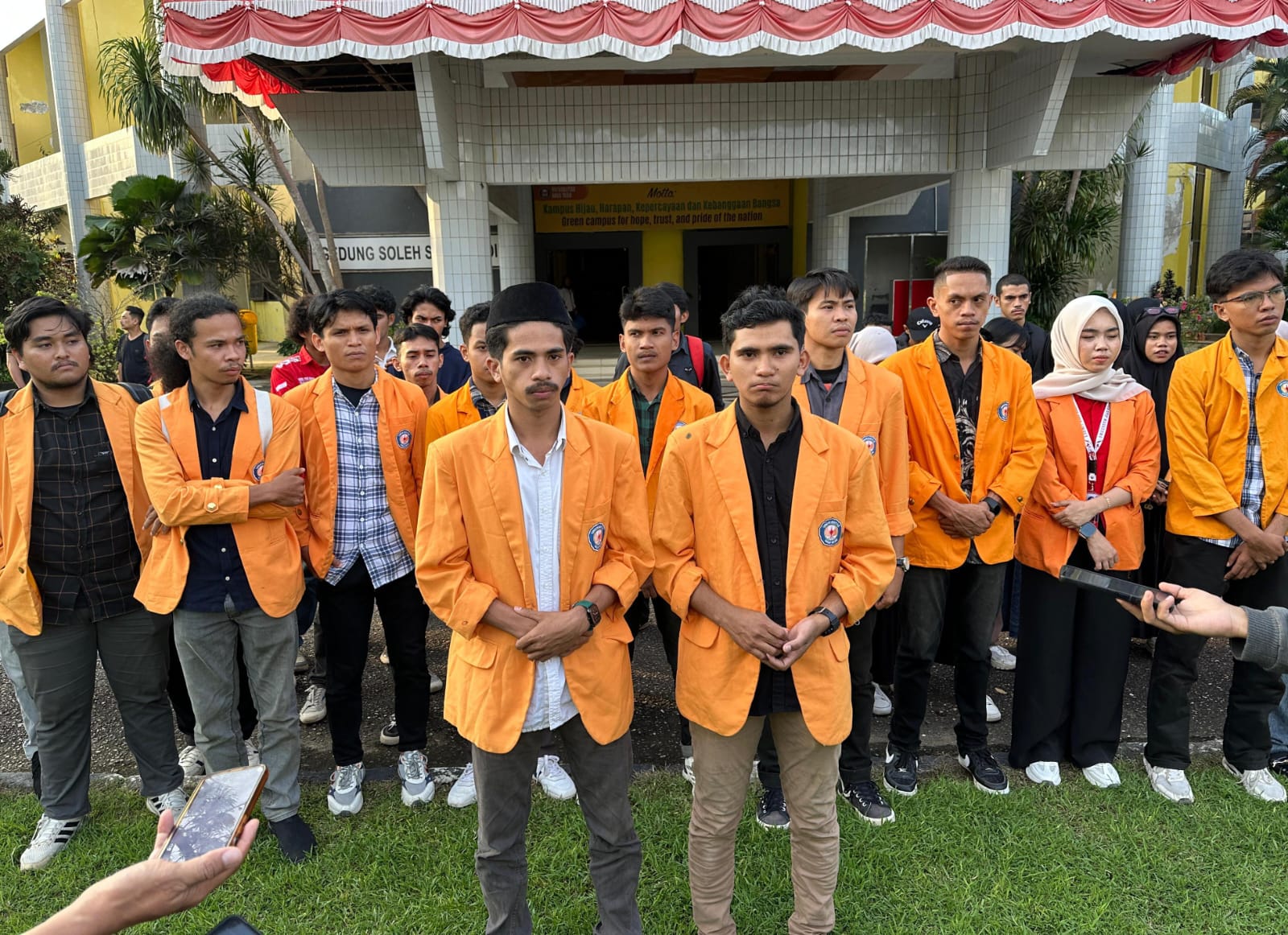 Nabil Al Mahmud didampingi Ketua Dewan Perwakilan Mahasiswa (DPM) UHO serta seluruh ketua BEM Fakuktas di depan Rektorat, Selasa (24/6/2025).