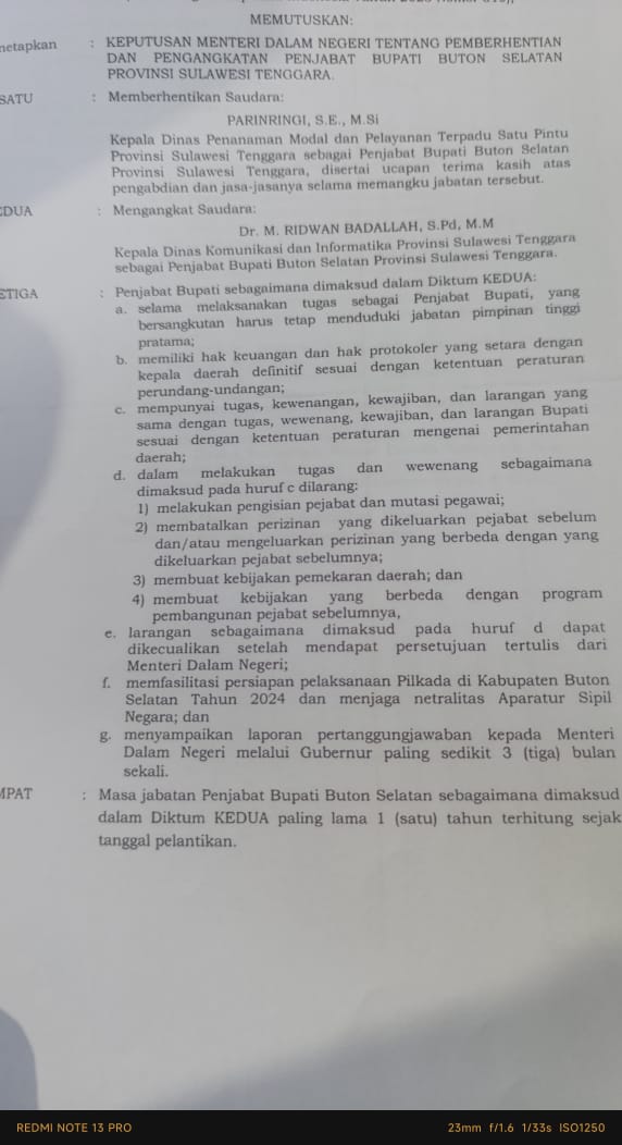 Kutipan SK Mendagri terkait pergantian Pj Buton Selatan.