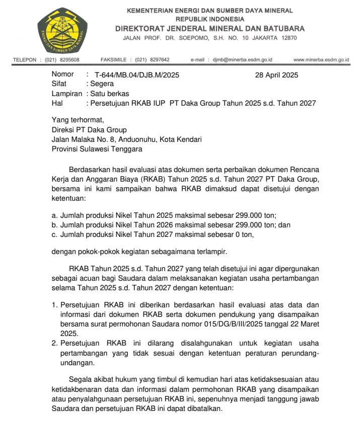 “PT Daka Group sudah mendapat persetujuan RKAB dari Kementerian ESDM untuk menjalankan usaha pertambangan selama tahun 2025 sampai dengan tahun 2027. Surat persetujuan sudah kami terima sejak 28 April 2025,” tegas Kadir.