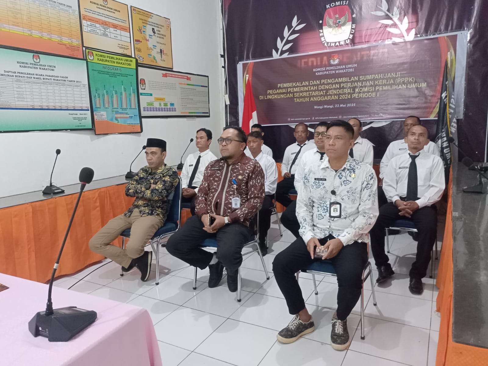 Senada dengan pengarahan Sekjend KPU RI, Sekretaris KPU Kab.Wakatobi Samsu Agusdar S melalui release Bakohumas KPU Wakatobi, membenarkan bahwa pada hari ini Jumat, 23 Mei 2025 telah di lakukan pembekalan dan pelantikan/Pengambilan Sumpah Janji Pegawai Pemerintah dengan Perjanjian Kerja (P3K) TA. Anggaran 2024 Periode I oleh Bapak Sekretaria Jenderal KPU RI.