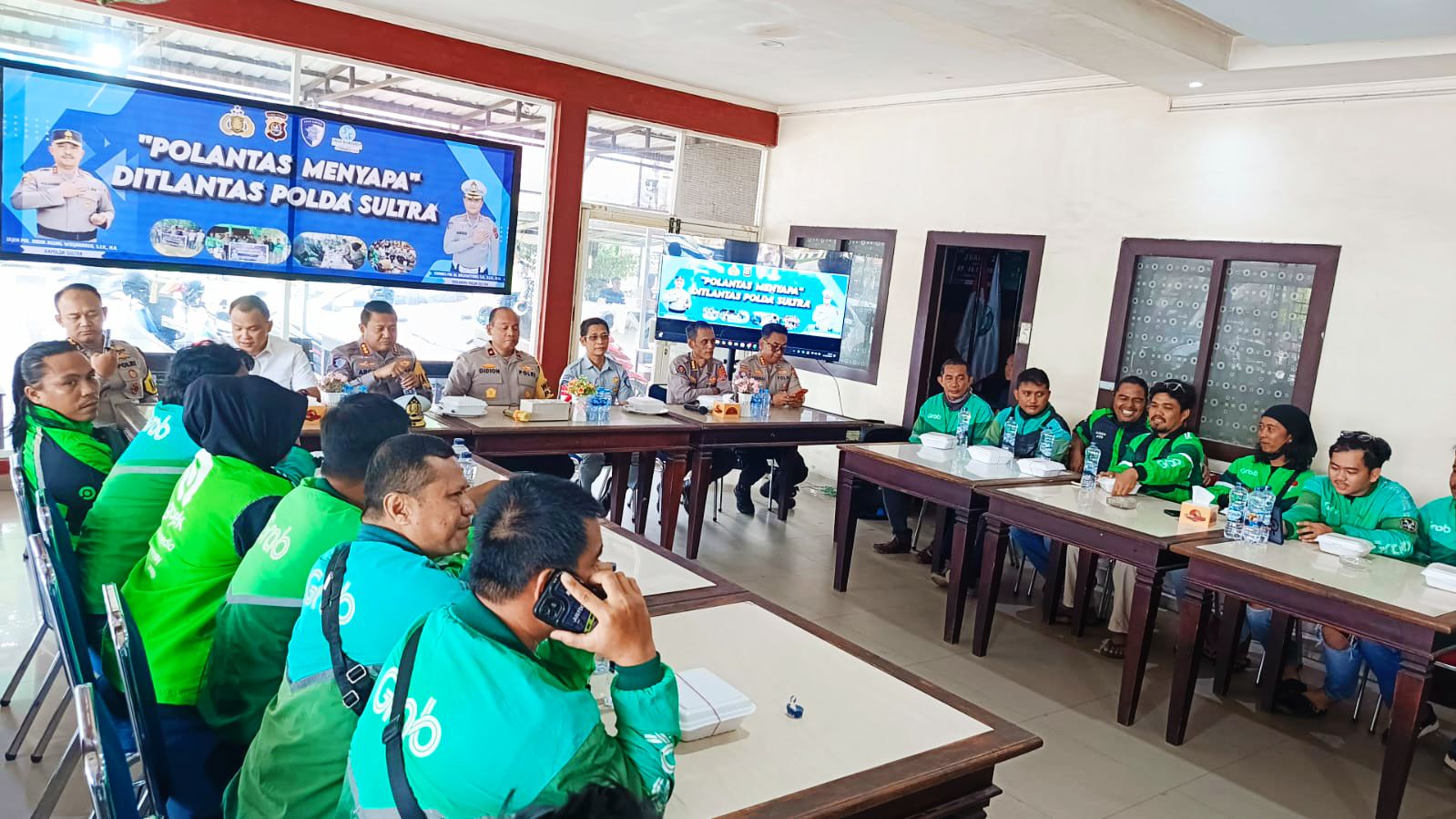 Kepolisian Daerah (Polda) Sulawesi Tenggara (Sultra) menggelar kegiatan bertajuk "Polantas Menyapa" bersama para pengemudi ojek online (ojol).